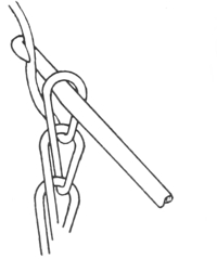 Figs. 10 and 11 show the crochet stitch, which is taken up at this point to show its similarity to the knitted loop and to 14explain the points of difference. The illustrations show very plainly the method of forming crochet loops and they also show that this stitch is simply a single chain or wale of loops succeeding one another.