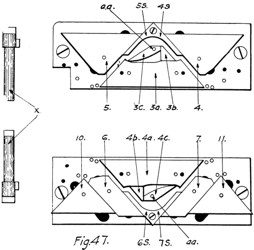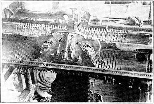We will take up the manner of mounting the deckers and the auxiliary parts through the medium of which the narrowing is done. Referring to Fig. 77, the decker points may be seen at a, a, mounted in a clamp in much the same manner as the hand deckers were mounted. The decker points, however, are somewhat different from those used in the hand decker, these latter being solid, either flat or round, while those on the automatic machine are half-round or U-shaped, as shown in Fig. 76, to facilitate placing them on the hooks of the needles.