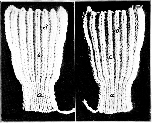 This first course of stitches, it should be noted, has the needle loop only, the sinker loop being tied in to form a base or edge from which to start. Fig. 7 shows the first position to form the loops with two needles. One full course is on the needle lettered a, while needle b is thrust through the first loop of the last course and receiving yarn to draw through a new loop.