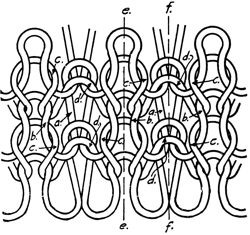 Crosswise of the fabric is the direction in which the yarn feeds while the fabric is in the process of construction, forming loops adjoining one another, or the same direction as the course. Lengthwise of the fabric is the direction in which the fabric is built up by drawing one loop through another, or the same direction as the wale. Therefore the width of the fabric is restricted by the number of loops or needles used as a base, while the length of the fabric has no restrictions other than the supply of material or the will of the knitter. Rib is an alternative expression for wale, but is applicable more particularly where the fabric has a wale on both sides, in which case it is shown as a rib fabric. Where a cloth has a wale on one side only it is known as a jersey fabric, and is also sometimes called flat goods. Rib fabrics will be taken up later for it is my purpose to deal only with jersey or flat fabrics until the theory of knitting is thoroughly explained.