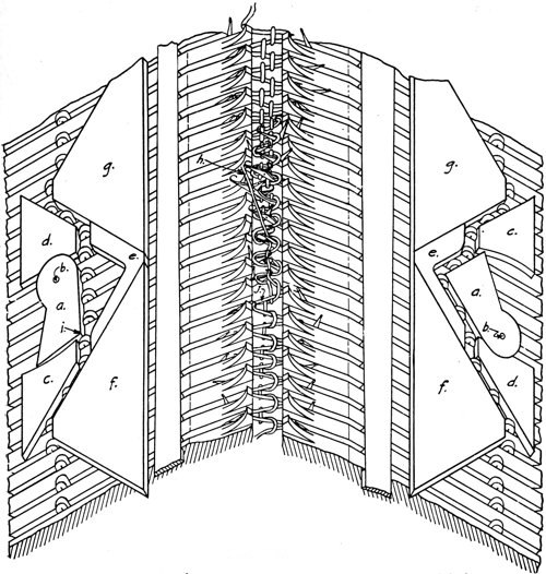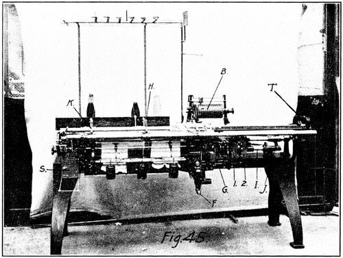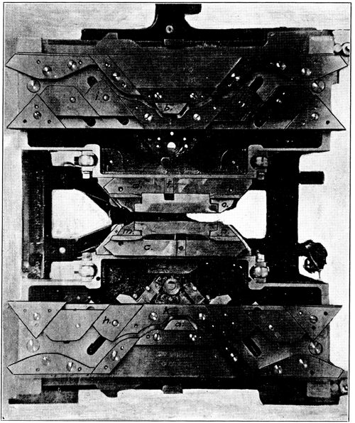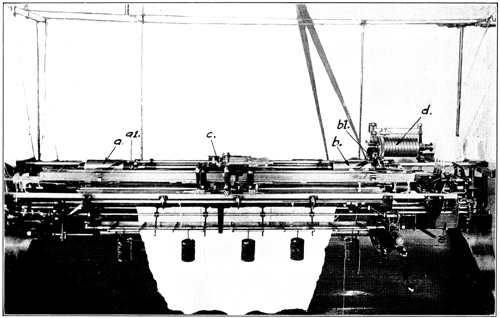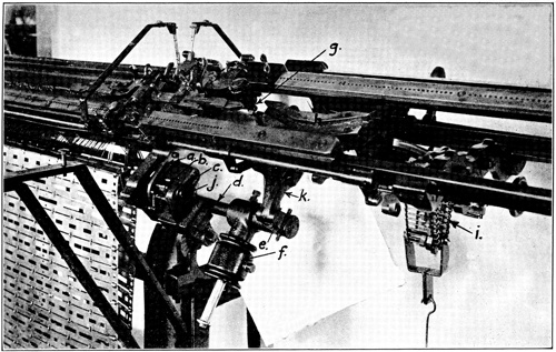 We will refer again to Fig. 77, where we will find two long flat steel straps, one on each side of the machine, marked e and e. It will be noted that these straps are attached securely to the yokes that carry the deckers, as well as to the crossheads or bridges marked l and m. Reaching across from one to the other and attached to these bridges is a yoke the two arms of which are indicated by k and k. These two arms come together at the center in a hub through which runs the worm or screw indicated by g.