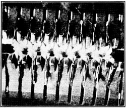 A study of Fig. 16 should be made in connection with the photographic reproductions, Figs. 17 and 18. Fig. 18 shows substantially the whole knitting machine, while Fig. 17 is a close-up view of that part of the machine which actually does the knitting. Fig. 16 shows the principle used to operate the needles.