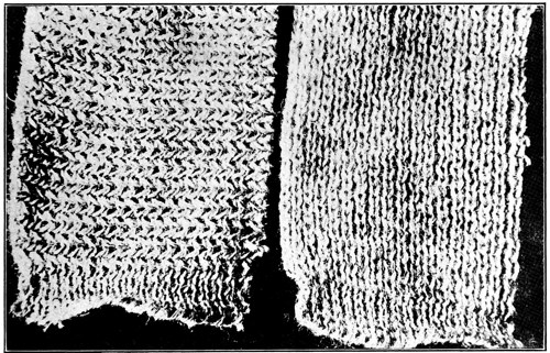 15It may be well to state here in passing, that all textile fibres have more or less flexibility or resiliency, and while this characteristic is infinitely small in any single fibre or hair, it is quite appreciable when there are hundreds of fibres grouped together and twisted into a yarn. This is the reason for the elasticity or stretch in knitted fabrics.