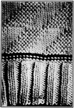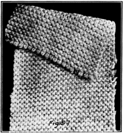 In this fabric the design is brought out on one side only, the back plate, and the needles on the opposite side or front plate are knitting each time the carriage is moved across the machine as explained in detail later. This may be plainly seen in Fig. 87, where the corner is turned over to show the back of the fabric.