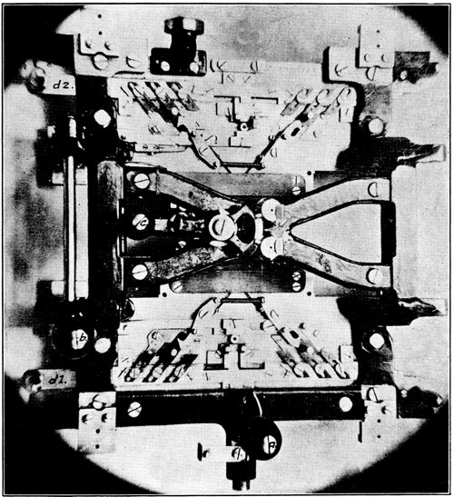 Now to find the method of selecting the proper needles at the proper time we will refer first to Fig. 86, which is a 134photographic reproduction of the cam system used in this machine; also to Fig. 90, which is a drawing of a cross section of the needle plates. It will be noted in Fig. 90 that there are two separate needle plates. The top one is for the needles proper, while the lower one is for the auxiliary needles.