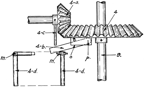 It will be noted that there is a pin extending from one side of the hub of the small pinion gear 4-a. On the back of gear 4 there is attached a box-like arrangement with the lever 4-b passing through it, which is pivoted at p and is held out in the position shown by a spring. Outside and near the outer end of this lever 4-b is another L-shaped lever 4-d, which is pivoted at m to the frame of the machine.