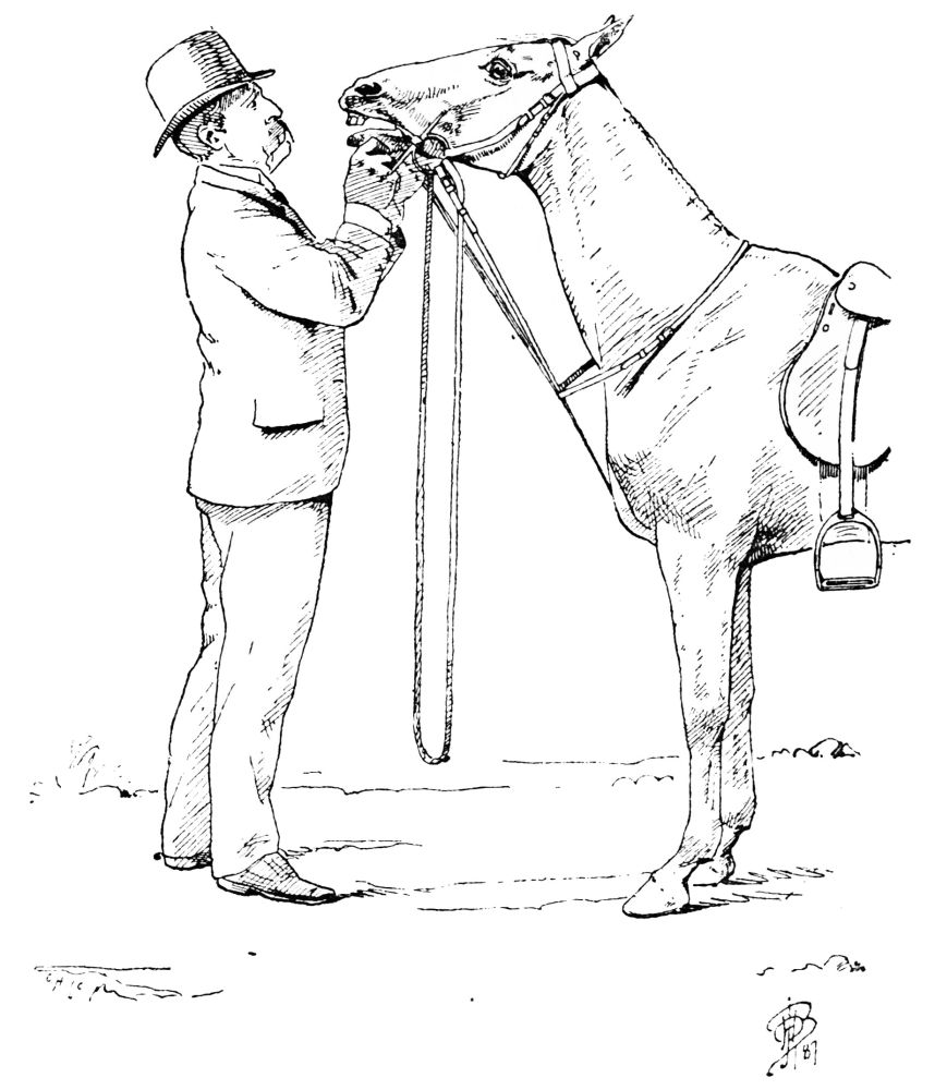 Mental qualities of the Horse.—The possibility of our being able to obtain an easy mastery over the horse, who is greatly our superior in strength and activity, and quite our equal in pluck, rests on the fact that instinct, rather than reason, guides his actions. To investigate this, we may try the experiment, when standing to the side and a little to the rear of a kicker, of touching him about the hocks or quarters with a conveniently long stick, when, if he “lets out” straight behind him, we may conclude that this is a purely reflex or instinctive action on his part. If the animal kicks at the stick, as the cause of annoyance, he certainly conducts himself{8} in a manner that is not altogether irrational. But if he tries to kick the man who holds the stick, we cannot deny him the possession of reasoning power. In order that my meaning be not misunderstood, I here suppose that this experimental horse is one which would viciously kick a person who, when standing behind him, would be rash enough to touch the animal, however gently, with his hand; and not one whose kick would be more of a push—to remove an offending object—than a blow. Luckily, horses that can reason, even to such a small extent as this, are rare.