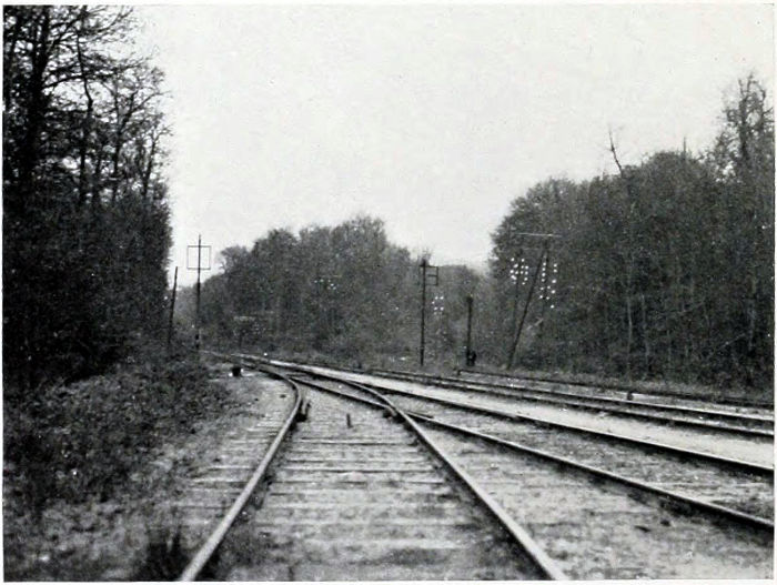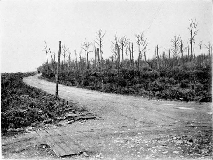 This southern part of the forest, on the road from St. Menehould to Verdun, has not been fought over, so that the trees are still in their natural condition. In the central valley, seen over the trees, lies Les Islettes in ruins. It was the farthest point of one of the Crown Prince's fruitless attempts to get south in 1915.