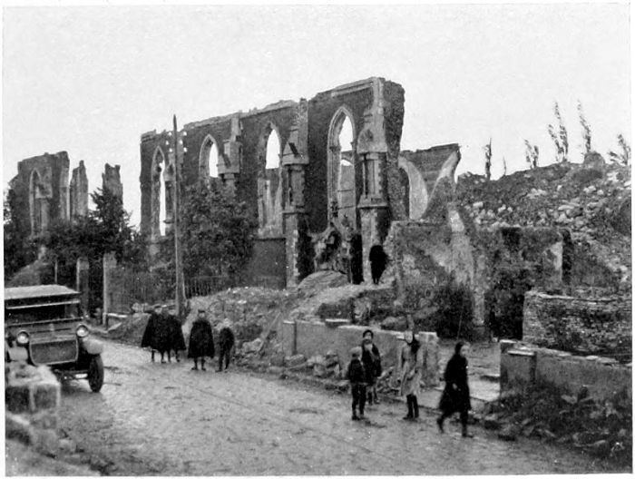 An official visit to the Front during the great days of October, 1918, when our chief difficulty and our great object was to keep up with the retreating Germans, gave me some first-hand knowledge of the devastation of the country which had been the result of four years of war. Familiar—too familiar—as this was to our soldiers, we at home—if I may take myself as a fair example of the average man—could really form no idea, even from the most vivid of the correspondents' descriptions, of what the ruined country was actually like. Roads, fields, orchards, were a featureless waste of shell-holes, often already covered with rank herbage altogether disguising their original nature. Villages were only recognisable by painted notices, "This is Givenchy," or sometimes "This was Givenchy"; not a house, not a wall, not a gate-post to show where they had been. Large towns like Ypres or Lens or Albert were little more than piles of brick, stone, and timber rubbish, through which roads were being cleared between immense piles of débris. In Rheims nearly as many houses were destroyed as the 13,000 said to have been burnt in the Great Fire of London, and smaller places like Soissons or Cambrai or Arras had suffered terribly. It was forbidden in our Army Areas at that time, no doubt for excellent reasons, to use a camera, but I made up my mind that when permission could be obtained I would do my best to secure some permanent record of what had happened.