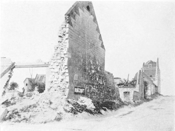 On the "Roman road," running south from Le Cateau to the Cambrai-St. Quentin road, the villages are now much damaged, probably rather in 1918 than in 1914, and notices were still standing—"Do not halt on this road"—at places towards the south. Another souvenir of 1918 was a notice near Maurois, "Pip Squeaks 6.30 to-night!" A less agreeable reminiscence was a sugar factory, thoroughly gutted by the Germans in characteristic fashion, beside the road near Estrées, a village itself in ruins. Along this road, as in many places on the Somme, the route, now destitute of trees, is marked by short wooden posts on each side placed at short distances apart, their object being, of course, to keep lorries on the track in the dark, or at least to give them notice if they strayed from it. Here and there many of the posts on one side of the road seemed to be sloping in one direction, and those on the other side in the opposite direction. The obvious inference was that the slope of the posts was due to the frequency with which the lorries had run into them!