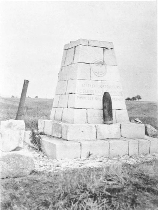 Having failed in the east, Ludendorff redoubled his pressure on the west of the Montagne, but British troops and Italian Alpini joined the French in holding up the critical points; and although the salient round Rheims itself was narrowed, the Marne was not reached and Epernay could only be shelled from a distance of seven or eight miles. Near Château Thierry, at the western end of the great salient, American troops aided the French in preventing advance. Already on the 18th of July, the first day of the advance, the French reached positions commanding the road and railway at Soissons, on the 21st Château Thierry was recaptured, and the next day saw the Germans back, for the last time, north of the river which had been the turning-point in 1914. The 26th of July saw an engagement which earned very special appreciation from Haig,[46] the taking of the Buzancy Château (Plate 116) and the little plateau on which it stands, about 300 feet above the River Crise, some four miles south of Soissons. Buzancy had been the object of an attack by the French and another by the Americans within a week from the commencement of the advance, but had been pertinaciously held by the Germans. It is in effect a narrow promontory between two deep valleys, and an almost unassailable position. On the 28th of [82]July the 15th Scottish Division were told off for the attack, and the Highlanders succeeded after a fight so notable that, although the position was not permanently held until a day or two later, the 17th French Division erected a memorial (Plate 117) in commemoration of it on the spot where the body of the foremost Highlander was found. The monument, simple and dignified, bears the inscription: "Ici fleurira toujours le glorieux Chardon d'Écosse parmi les Roses de France." Five days later the French entered Soissons once more, and on the 5th of August the Aisne was again crossed, and Fismes (Plate 95), on the Vesle, was taken by the Americans on the same day. But Foch's plan led him to leave this district for a time while equally important advances were made elsewhere.
