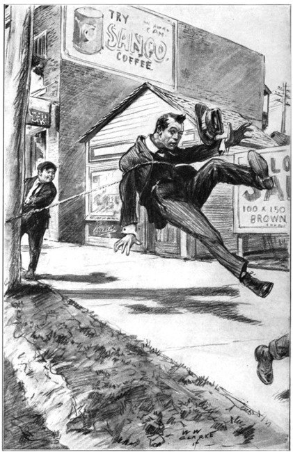 Then I heard Collins say something that sounded like, “Wo-oo-of!” only louder and more surprised; and there was a scrape and a scuffle. I grabbed a hitching-post and stopped sudden. There was Collins in a heap on the sidewalk, with the lasso around his body and one arm, and Mark giving the rope a turn around his post and pulling like all-git-out.