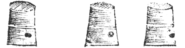 This feat is one of the greatest that the jugglers have done, and is inferior to none. To do this, you must go to some tinman, or any body that knows how to make your holes room enough for a die to go in and out, and then let them clap a good half-penny upon them all, and so make them fast, and nobody can tell them from real ones; then you must get a cap to cover your half-pence, a cap and a die for the company to fling to amuse them; when you are thus provided with half-pence, a cap, and a die, the manner of performance is thus: desire any body in the company to lend you seven half-pence, telling them that you will soon return them their own again; then say, gentlemen, this is made just fit for your money; then clapping your cap on, desire somebody in the company to fling that die to see what they can fling, and in so doing, take off the cap and convey your false money into the cap, so that the company may not see you put it in, then with your cap cover the die, so with your right-hand take up the true money, and put it into the left under the table, saying, Vada, begone, I command the die to be gone, and the money to come in the place; so take up the cap, and the die is gone, and the money is come, covering the money again with the cap, so taking the true money in your right-hand, and knocking under the table, making a jingling as though the money was coming through the table, then flinging then on the table, say, there is the money, and with your right-hand take off the cap, saying, and there is the die; so convey the false money into your lap, and there is the cap likewise. This is an ingenious feat if well handled, here make the figure of a die, and the fashion of seven half-pence, and a cap to cover them.