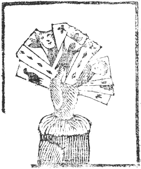 To do this, you must first privately drop a drop of water or beer about the bigness of a two-pence upon the table before you, were you sit, then rest your elbows upon the table so as the cuffs of your sleeves may meet, and your hands stick up to the brims of your hat; in this posture your arms will hide the drop of water from the company; then let any one take the cards and shuffle them, and put them into your hands; also let them set a candle before you, for this trick is best done by candle light, then holding the cards in your left hand, above the brim of your hat, up close to your head, so as the light of the candle may shine upon the cards, and holding your head down; so in the drop of water, like a looking-glass, you shall see the shadow of all the cards before you; draw then the fingers of your right-hand along upon the cards, as though you felt the spots, name the cards, and then lay him down. Thus you may lay down all the cards in the pack, one by one, naming them before you lay them down, which will seem very strange to the beholders, who will think that you have felt them out.