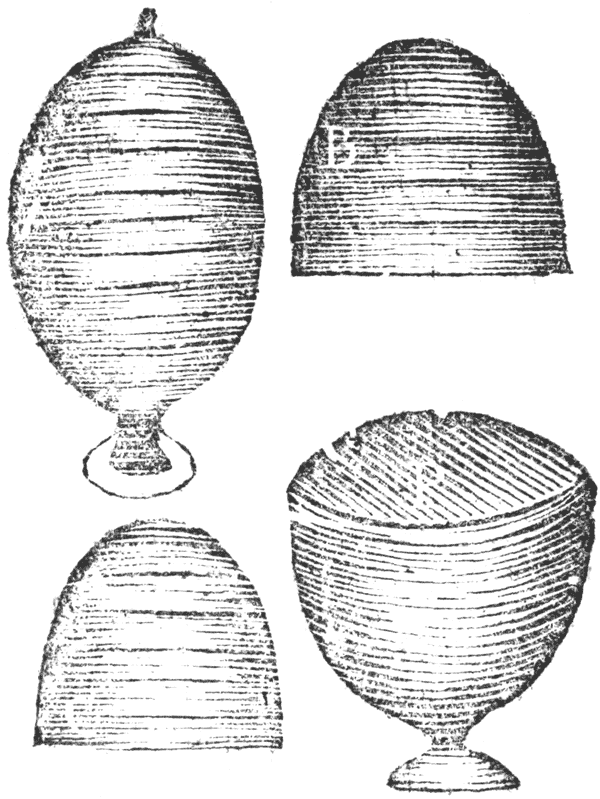 A, signifies the egg box, made in the fashion of two bee-hives put one upon another; B, the upper shell; C, the inner shell, covered over artificially with the skin of an egg; P the lower part of the shell-box; putting B, which is the outward shell, upon C, and both upon P, as it stands, makes the box perfect. To do this trick, call for an egg, then bid all standers-by look on it, and see that it is a real egg, setting the box on the table, upon the foot C, take off the upper part, B, C, with your fore-finger and thumb, then placing the egg in the box, say, You see it fairly in, and uncovering it again, likewise say, You shall see me fairly take it out, putting it into your pocket in their sight; open your box again and say, There is nothing, close your hand about the middle of your box, and taking B, by the bottom, say, There is the egg again, which appears to the spectators to be; so clapping that in again, and take the lid of C, in your finger and thumb, say, There it is gone again.