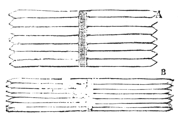 Take a book seven inches long, and about five inches broad, and let there be forty-nine leaves, that is, seven times seven, contained therein, so as you may cut upon the edges of each leaf six notches, each notch in depth of a quarter of an inch, with a gouge made for that purpose, and let them be one inch distant; paint every thirteenth and fourteenth page, which is the end of every sixth leaf and beginning of every seventh, with like colours, or pictures; cut off with a pair of sheers, every notch of the first leaf, leaving only one inch of paper, which will remain half a quarter of an inch above that leaf; leave another like inch in the second part of the second leaf, clipping away an inch of paper in the highest place above it, and all notches below the same, and orderly to the third and fourth, and so as there shall rest upon each leaf only one nick of paper above the rest, one high uncut, an inch of paper must answer to the first directly, so as when you have cut the first seven leaves in such a manner as I have described, you are to begin the self same order at the eighth leaf, descending the same manner to the cutting the other seven leaves to twenty-one, until you are past through every leaf all the thickness of your book, &c.