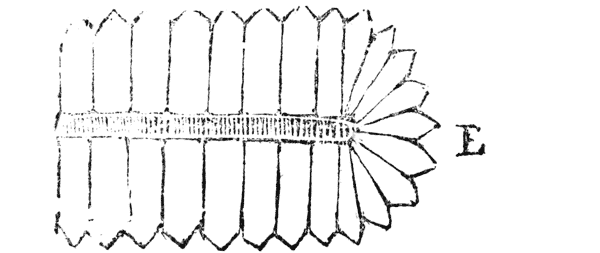 This pudding must be made of tin, consisting of twelve or thirteen little hoops made as in the figure following, so as they may almost seem to fall one through another, having little holes made at the biggest end thereof, that it may not hurt your mouth, hold this pudding (for so it is called) privately in your left hand, with the hole end uppermost, and with your right hand take a ball out of your pocket, and say, ‘If here is ever a maid, that has lost her maidenhead or an old woman that is out of conceit with herself, because her neighbours deem her not so young as she would be, let them come to me, for this ball is a present remedy:’ then seem to put the ball into your left hand, but let it slip into your lap, and clap your pudding into your mouth, which will be thought to be the ball that you shewed them; then decline your head, and open your mouth, and the pudding will slip down at its full length, which with your right hand you may strike it into your mouth again, doing this three or four times, then you may discharge it into your hand, and clap it into your pocket without any suspicion, by making three or four wry faces after it, as tho’ it stuck in your throat, and if you practise smiting easily upon your throat with your fist on each side, the pudding will seem to chink; as if it were flying there; then say, ‘Thus they eat puddings in High Germany, they fling it down their throats before their teeth can take possession of it.’