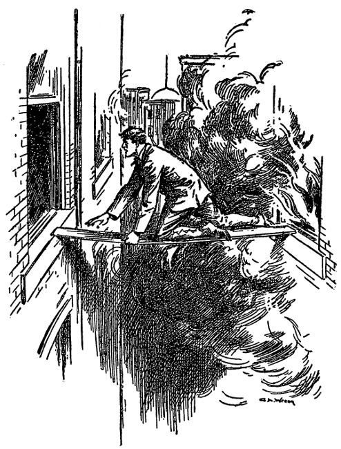 As he reached the door, clouds of blue smoke met him. The vapor almost choked him. Whoever was tampering with the motor had neglected to pay much attention to the lubricating devices, with the result that the fumes of burning oil filled the air.
