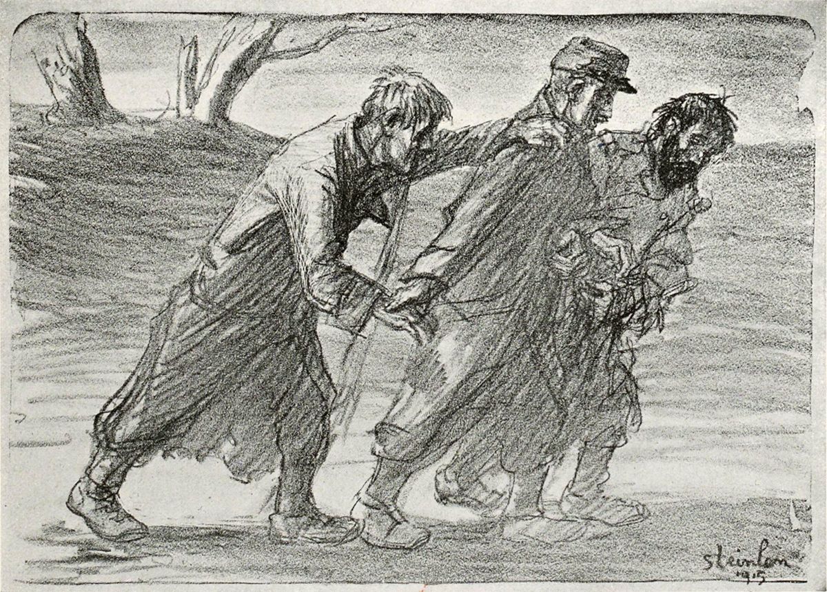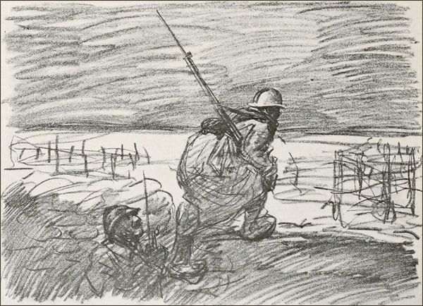 Steinlen a intitulé une de ses séries de dessins: Les Ouvriers de la Guerre. Cela est typique. Cela définit bien ce qu’est pour nous tous cette lutte: un travail, plus important que tous les autres travaux qu’il nous a fait délaisser, une entreprise collective de démolition d’un système d’idées monstrueuses, coûte que coûte, avant la reconstruction possible—l’immense déblai de l’avalanche barbare écroulée au milieu de la civilisation.
