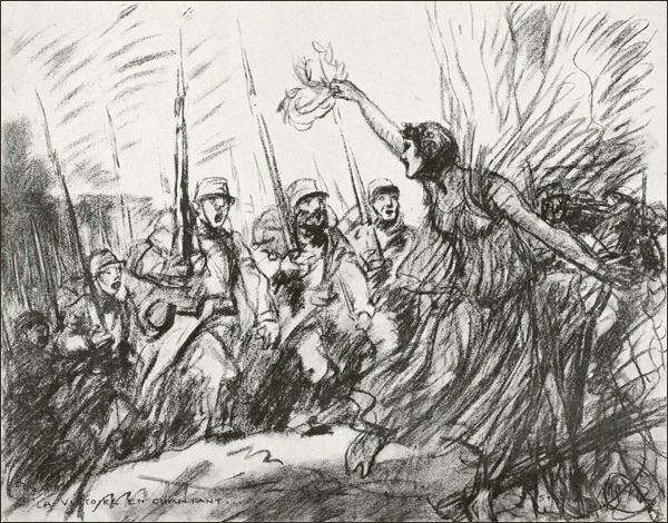 Il lui suffit de quelques centimètres d’eau-forte pour nous dire le serpentement de la relève dans l’étouffement boueux des boyaux—des formes confuses, des visages masqués, un faible miroitement sur la convexité des casques. Il n’a fait apparaître qu’à peine l’ennemi en deux ou trois lithographies: en l’une d’elles, un soldat prussien se dresse, la botte sur un cadavre de femme. Dans les deux autres, grandes et peuplées de foule, l’Entrée et la Sortie des geôles allemandes, une humanité malheureuse, paysans, journalières, prêtres, marmots, défile sous les coups de crosse des brutes, et ici encore tout est éloquent, expressif, vrai et poignant sans une seule velléité déclamatoire. Il faut enfin en venir à quelques compositions d’un caractère plus allégorique, où l’artiste révolutionnaire a exhalé le cri de son âme. La plus belle me semble être «La Victoire en chantant». A grands traits de fusain s’esquisse la jeune République nue, emportée dans un mouvement superbe, derrière laquelle s’élance au pas de charge la ligne des soldats. Ici tout est rythme et puissance, et si l’on évoque Daumier, c’est qu’il est immanquable qu’une très belle chose n’en rappelle pas une autre. Ailleurs, Marianne embrasse ses gars blessés pour elle. Deux féroces lithographies montrent la Belgique bâillonnée, la Serbie, nue et décharnée, écartelée sur la croix de supplice où la clouent quatre baïonnettes. Ce sont des visions si violentes qu’on peut à peine les regarder, comme ces dessins de Victimes sanglantes, hachées par le sabre et la mitraille, que l’artiste a rêvées en songeant aux boucheries de Dinant et de Louvain. D’autres ébauches, d’un faire large et brutal, reprennent le thème de la Marianne nue, telle que le génie de Delacroix la conçut le premier, et l’unissent au mouvement de la Marseillaise de Rude. Steinlen est, en effet, de ces hommes qui ont paru être des socialistes, des révolutionnaires, des anarchistes, aux tièdes et aux satisfaits, parce qu’ils aimaient le peuple dévoué et pitoyable et souhaitaient plus de justice, mais qui, en réalité, s’appelaient et étaient tout simplement, aux temps héroïques de Delacroix ou de Rude, des républicains conformes au véritable esprit libertaire, des Français indépendants, rebelles à tout joug, les Français du Chant du Départ, les amoureux de la belle fille au bonnet phrygien. Steinlen est même peut-être, de tous les 34 artistes qui nous honorent, le type le plus net de l’artiste républicain, analyste de notre prolétariat, poète de notre idéal social.