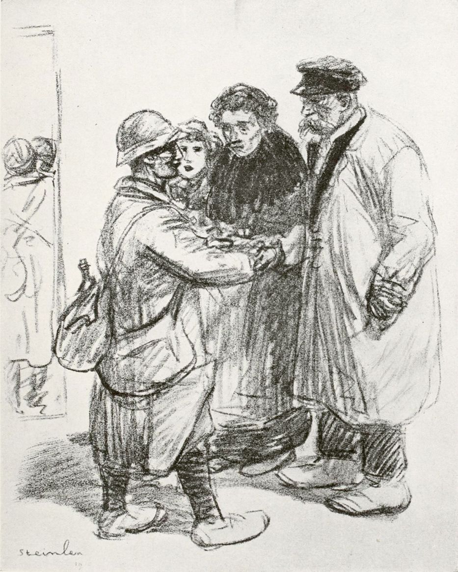 On ne décrit pas un tel art, car il est lui-même une synthèse de la description littéraire, et il faudrait s’arrêter à chaque croquis. J’essaie moins de suggérer l’œuvre que d’en définir les directions en rendant un juste hommage à celui qui, de toute la science de son beau métier et de toute la sincérité de son cœur profond, l’a réalisée. C’est encore un des caractères de cette conception si spéciale que la grande préséance donnée par Steinlen, en ses séries, aux femmes et aux enfants. Il y en a beaucoup plus que de soldats. Par-dessus tout, un chef-d’œuvre d’art, de grâce triste et d’amour: le convalescent infirme, la béquille sous un bras, s’appuyant de l’autre sur une jeune femme aux grands voiles. Rien ne rendra par des mots le modelé de ce jeune corps féminin sous les étoffes et les expressions de ces deux visages, et la technique miraculeusement simple, n’intervenant juste que pour signifier le sentiment. Que cela est donc beau! Courageuse est encore une chose admirable, montrant auprès du soldat prêt à partir, la femme fière, raidie, s’interdisant de pleurer. Et c’est une autre admirable chose, simplifiée à l’extrême, que ce dessin des Convalescents, deux jeunes soldats dont l’un se courbe, accablé, sur sa canne, tandis que l’autre, maigre et livide, défaille à demi, la face vers le ciel, le dos appuyé au mur de l’hôpital. C’est encore ici une œuvre où les limites de la poésie, du roman et de l’art du dessin ne sont plus discernables, où l’émotion emprunte tous les moyens pour s’imposer, où on ne pense pas à ces moyens, où l’idée seule compte. Ce n’est qu’après qu’on se demande comment c’est fait, et quelle magie sort de ce bout de papier crayonné, de cette note de carnet.