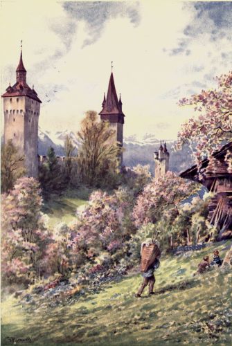 However, there is no occasion to become restive at the prospect; Lucerne itself is the most charming of preludes and points d’appui for all that lies afield. Particularly is this so if opportunity allows us to be here in the spring of the year, with the fruit trees all a-flower and the grey-towered Musegg ramparts deep set in a rosy-white haze; and with the fields all a-wave with blue, white, and gold, and the lakeside{7} promenade laden with the myriad flower-spikes of the horse-chestnut trees. Spring is earlier here—some ten days earlier in May—than away at the very feet of the Alps. We may well be content, then, to remain awhile amid such vernal freshness, studying the life and history of the town of the “wooden storks’ nests”, and revelling on the quay in the Alpine panorama framed by the soft blue sky and blue-green waters—a panorama which is never more delightful than at this season of the year, never even in autumn when October clears the atmosphere, robes the near hills in fire, deepens the blue colouring of distant rock and forest, and spreads a new white drapery upon the higher peaks.