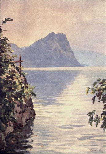 And this elusive yet striking quality of beauty is no particular possession of the mere distant view from Brunnen; it is just as evident upon near inspection. From Tellsplatte or from Flüelen, from Isleton or from{52} the Rütli, or from any open spot upon the whole length of the wonderful Axenstrasse, “this temple of wild harmony” has all the charming variety and mystery of lovely woman. The close intimacy of severe and towering crags (as at Sisikon and Isleton) does nothing to dispel it; rather is it accentuated by the presence of something so rudely definite. Whether it be where the bare precipice plunges headlong to the Lake (as at the Teufelsmünster, near Flüelen), or whether it be where the beech woods run down to meet the waters (as at the Rütli and round about the Schillerstein), sublimity, which in part is mystery, is never wanting. Always there are heights, or snows, or distances over which the thin air plays in endless moods of light and shade. The Bay of Uri is indeed a wonder-spot in which to roam and float and dream. Well might the water-sprite in Gerhart Hauptmann’s The Sunken Bell have drawn his inspiration from men and women to be found wandering here entranced; well might these scenes by Uri’s waters have given him the insight to exclaim:—