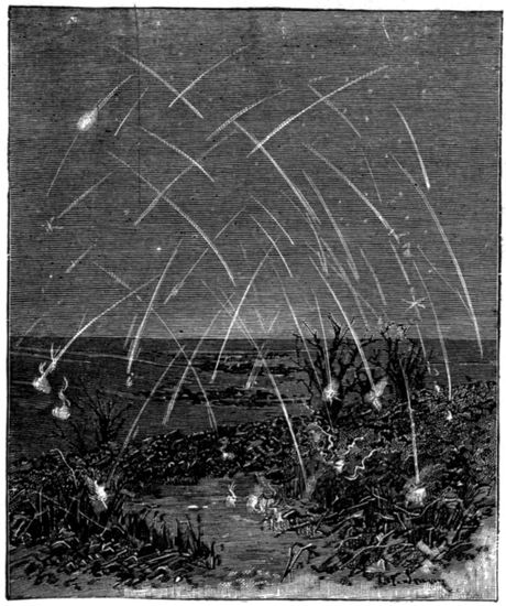 “Besides these masses and these gases, perhaps also the bolides of which we were speaking, coming in clouds, will kindle conflagrations at various places on the continents; dynamite, nitroglycerine, panclastite and royalite would be playthings in comparison with what may overtake us, but this does not imply a universal 48cataclysm; a few cities in ashes cannot arrest the history of humanity.