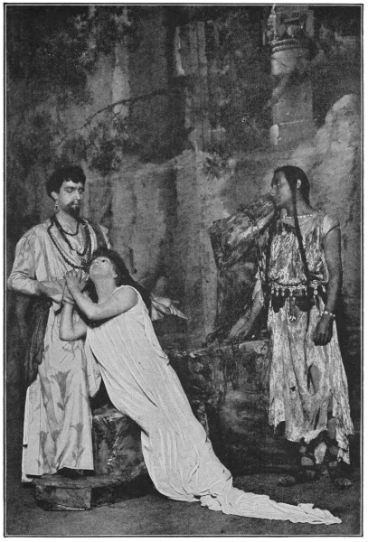 On the 8th February she brought out a piece by M. Sardou, Spiritisme. It was a failure. Sarah’s talents were extolled to the skies as usual, but in comparison with her previous appearances the reception of the play was cold. After twenty-five indifferent performances she was obliged to revive La Tosca, and then bring out a piece, Snob, by M. Gustave Guiches, in which there was no part for her. Easter week arrived, and she took advantage of it to give a series of performances of M. Rostand’s religious drama, La Samaritaine, which met with triumphal success. Says M. Sarcey—“Sarah, transfigured and drinking in the life-giving Word, and repeating the words ‘I am listening, I am listening’ with all a neophyte’s ardour, is a sight to be seen. Her personality completely fills the second act. Full of the divine fire, she evangelizes the crowd wherever she goes. Her success was very great.”