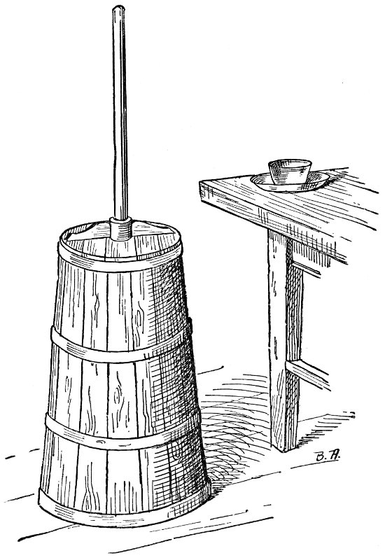 A wooden churn. Its like is used to this day. In former times churning was one of the tasks that many a farmer’s boy had too much of. On the lower end of the handle, which passed down through a hole in the center of the cover, was a disk of wood, perforated and fitting loosely in the tall tub. The tub was 58 partially filled with cream and the butter was made to “come” by moving the handle up and down and thus splashing the disk up and down in the cream.