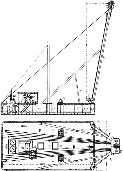 Fig. 17 (entnommen aus Beck S. 481) gibt eine Darstellung von zwei übereinander an demselben Stützgerüst angeordneten Drehkranen, zu dem Ausheben eines Kanals bestimmt. Die durchaus zweckmäßige Anordnung des Gerüstes mit den wohldurchdachten Einzelheiten ist besonders bemerkenswert. Auch der Arbeitsvorgang ist gut überlegt: er gestattet ein gleichzeitiges Arbeiten in zwei Geschossen und ein stetiges Vorrücken der ganzen Maschine.