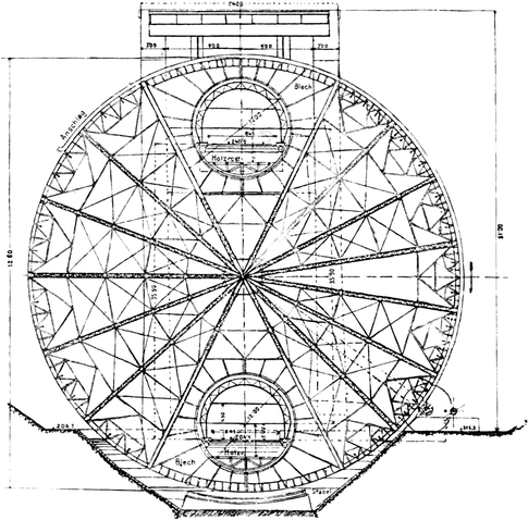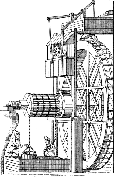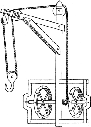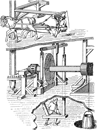 Auf diese Bestrebung, die Arbeit des Lastenhebens in eine den menschlichen Muskeln besser angepaßte Form zu bringen, beschränken sich alle Ausführungen bis zum 15. Jahrhundert. Tierkraft und Wasserkraft waren zwar schon den Römern bekannt, wie[S. 4] uns Markus Vitruvius Pollio um 16 v. Chr. berichtet, aber Pferdegöpel und Wasserrad wurden damals nur zum Betrieb von Mahlmühlen verwendet und selbst diese ließ man lieber durch Sklaven betreiben, die in dem günstigen Klima Italiens billiger zu beschaffen und zu unterhalten waren als Pferde und hölzerne Maschinen.
