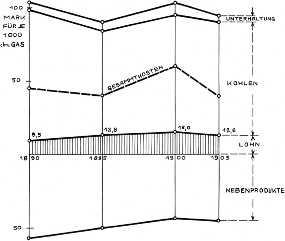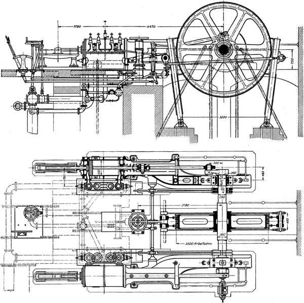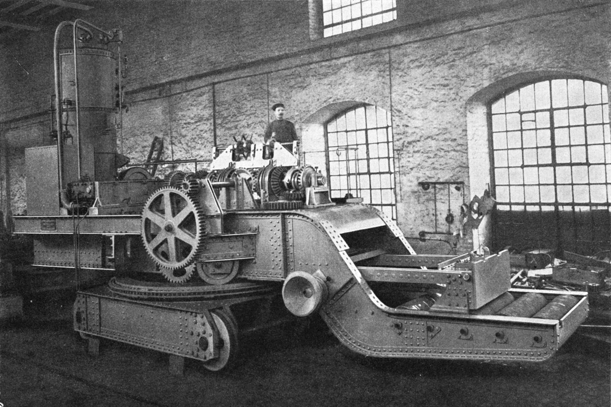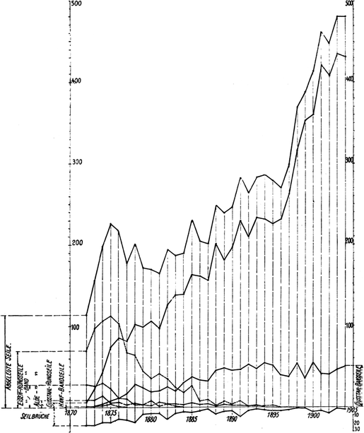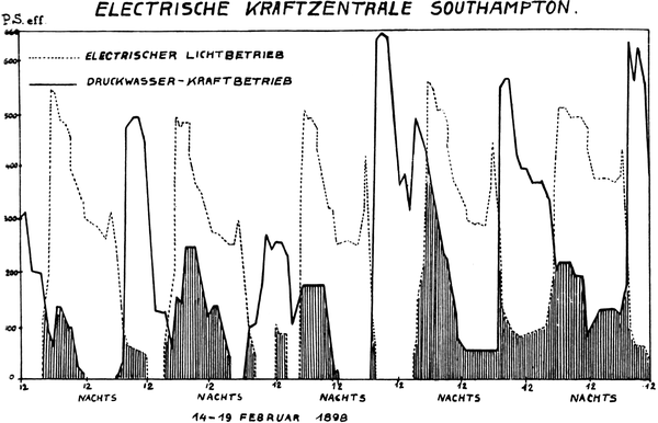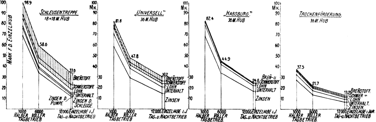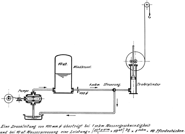 Erst mit dem Jahre 1890 trat ein Umschwung ein. Die elektrische Kraftübertragung, die um das Jahr 1880 bekannt geworden war, wurde gegen 1890 für den Hebemaschinenbetrieb nutzbar gemacht.