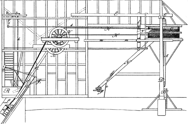 Die Anwendung dieser Naturkräfte für Hebemaschinen anderer Art, etwa für den Umschlag vom Schiff auf das Landfahrzeug war kaum möglich, denn die Wasserkraft war überhaupt nur in bergigem Gelände verfügbar und ebenso wie der Tiergöpel zu schwerfällig und sperrig für den beschränkten Raum am Kai. Wir finden daher vom Jahre 1500 bis gegen die Mitte des 19. Jahrhunderts keinen wesentlichen Fortschritt. Die Zeichnungen von Fördermaschinen und von Kaikranen aus dem Beginn des 19. Jahrhunderts sehen fast genau so aus wie diejenigen aus dem 15. Jahrhundert; nur die Abmessungen sind mit den zunehmenden Teufen und Lasten etwas gewachsen.