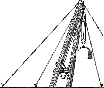 Aus der griechischen Zeit liegen bereits Nachrichten vor, nach welchen die einfachsten Hebemaschinen — Flaschenzug, Trommelwelle, Stirnräder und Wippkran — damals bereits in Gebrauch[S. 12] waren. Das Werk »Barülkon« über Hebemaschinen von Heron dem Älteren, der etwa 120 v. Chr. lebte, ist freilich verloren gegangen (Theodor Beck, S. 5). Einen Auszug aus diesem Werk bildet indessen das »Pappi Alexandrini collectionis liber 8«, das um das Jahr 300 n. Chr. geschrieben wurde. In diesem Buche sind Flaschenzug, Trommelwelle mit Spillenrad, Stirnräder und ein einmastiger Wippkran (Monokolos) einfachster Art deutlich beschrieben. Die Beschreibung des Wippkrans lautet nach der Übersetzung von Theodor Beck wie folgt: »Aber um Lasten in die Höhe zu heben konstruiert man entweder einbeinige oder zwei- oder drei- oder vierbeinige Maschinen. Was die einbeinige Maschine betrifft, so nimmt man ein festes Holz, dessen Länge größer ist als die Höhe, bis zu welcher man die Last aufziehen will. Wenn es auch an und für sich fest ist, so umschnürt man es doch mit einem in Windungen darum geschlungenen Seile. Die Zwischenräume dieser Windungen sollen nicht größer sein als vier Handbreiten. So wird nicht nur das Holz fester, sondern die Windungen können auch den Arbeitern wie Leitersprossen dienen, wenn sie in die Höhe steigen wollen. Wenn das Holz nicht stark genug zu haben ist, setzt man es aus mehreren Hölzern zusammen. Diese Säule wird dann in einer Bohle aufgerichtet, und an ihrer Spitze werden drei oder vier Seile befestigt, herabgeführt und an irgendeinen festen Gegenstande angebunden, so daß die Holzsäule, wenn nach irgendeiner Seite hin gezogen wird, nicht wankt, sondern von den gespannten Seilen festgehalten wird. An der Spitze angebundene Flaschenzüge werden nach der Last hingezogen und ziehen, entweder mit der Hand oder durch Göpel in Bewegung gesetzt, die Last an, bis sie zur gewünschten Höhe gehoben ist. Wenn ein Stein (der die Last bildet) auf eine Mauer, oder wo man sonst hin will, gelegt werden soll, so läßt man, nachdem Vorstehendes geschehen, eines von den an der Spitze befestigten Seilen, und zwar dasjenige, welches sich auf der der Last gegenüberliegenden Seite befindet, nach und neigt die Säule. Auch legt man Walzen unter solche Stellen der Last, wo das Bindeseil nicht herumgeschlungen ist, und läßt dann die angespannten Flaschenzugseile nach, bis die Last auf den Walzen sitzt. Nachdem dann das Bindeseil gelöst ist, bewegt man die Last mit Hebeln, bis sie an die Stelle gebracht ist, wo man sie haben will. Dann bringt man die Bohle, worauf die Säule steht, indem man sie mit Seilen an den Händen fortzieht, an eine andere Stelle des Gebäudes, läßt die Seile wieder herab, bindet sie wieder an, und gebraucht die[S. 13] Maschine wieder auf dieselbe Weise, wie wir es beschrieben haben.« — Fig. 5 ist eine Zeichnung von Leonardo da Vinci (entnommen aus Th. Beck S. 447), die dieser Beschreibung des Pappus entspricht.