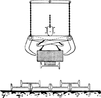 Neuerdings hat Choisy an vorgefundenen Resten und Spuren Untersuchungen über die Entstehung der egyptischen Bauten angestellt und in dem Buch »L’art de bâtir chez les Egyptiens« dar[S. 10]gelegt. Aus diesen Forschungen geht zunächst hervor, daß schwere Lasten durch eine große Zahl gleichzeitig angreifender Hebel mit Gewichtsbelastung gehoben wurden (Fig. 2, entnommen aus Choisy, S. 76), wobei nach jeder Hebung die Unterstützungspunkte der Hebel durch Aufschütten von Erde höher gelegt wurden, während die Last selbst auf einer Erdschüttung aufruhte. Einzelne Quadern wurden durch wiegenartige Wälzungshebel abwechselnd gehoben und durch Unterlagen zeitweise unterstützt. (Fig. 3, entnommen aus Choisy, S. 82.) Die Aufstellung von Monolithen ging in der Weise vor sich, daß sie in wagrechter Lage zunächst durch Hebel stufenweise gehoben und auf vorübergehend aufgestellte Mauern gelagert wurden. (Fig. 4, entnommen aus Choisy, S. 124.) Dann ließ man das untere Ende des Monolithen auf einem Mauersektor heruntergleiten, wobei[S. 11] die stützende Erdschüttung allmählich entfernt wurde. Schließlich wurden Sandsäcke unter den Fuß gelegt, die stützenden Hölzer durchgesägt und nun die Sandsäcke allmählich entleert, so daß sich der Steinblock ohne Stoß auf sein Fundament aufsetzte.
