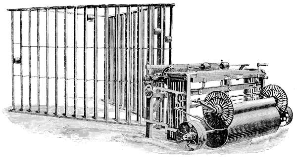 Here all the principles of the modern loom were present, although in very different form, and it is only in details that the loom of a century later presents a different aspect. In 1834 the weft stop motion was patented by Messrs. Ramsbottom and Holt, which was perfected seven years later and patented in its present form by Messrs. J. Bullough and Kenworthy, of Blackburn. To these gentlemen is due the invention of an improved dressing machine called a “tape,” the forerunner of slashing; also the take-up motion for cloth. They, too, patented the loose reed loom and the roller temple; but from records of the time and tales told by the older section of the community in Blackburn to-day, apparently, it is to John Osbaldeston "that the honour is due of breaking the concussion of the loom and inventing an improved temple. He also originated many of those inventive appliances so essential to adapt the power loom for weaving fancy goods, but was not successful in securing any pecuniary advantage to himself, thus illustrating the fact that not every benefactor of his species meets with the reward due to his merits."[1] The creative spirit which carried cotton-spinning machinery to so high a degree of perfection, was directed also to the improvement of the preparatory machinery of the weaving department.