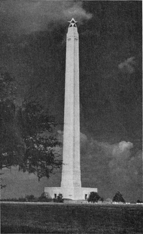 The great shaft of San Jacinto, piercing the sky from the scene of the historic conflict between Sam Houston’s pioneers and Santa Anna’s Mexican invaders, was erected as a memorial to the Texas heroes, commemorating the Centennial of 1836. Appropriations aggregating $1,866,148 were made by the State of Texas and the Federal Government for the construction of the monument and improvement of San Jacinto State Park. Of this amount approximately $1,200,000 was used in building the monument.