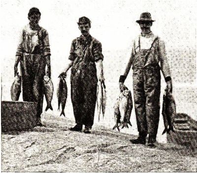 Down the long row they go, the boat's bottom gradually filling up with the big shad. Sometimes a net will have only one or two in it, while fifteen or twenty are occasionally caught in a single net when the season is at its height. A good haul will often yield three hundred shad, and the fishermen hurry ashore to pack them off to the markets. But shad are not the only fish they get in the nets. Catfish are often pulled up with shad, as well as many other varieties. Some of them are taken ashore and cooked, and others are thrown back into the water.