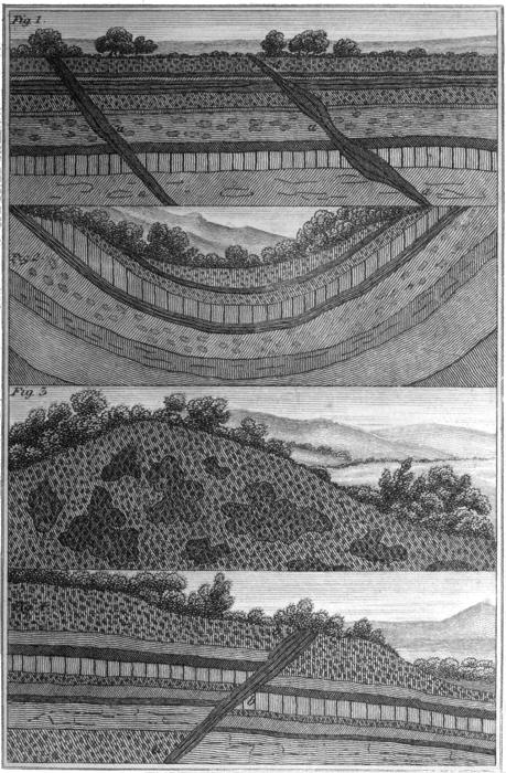 2. If we penetrate beneath the surface of the earth, we observe there a very remarkable arrangement. Instead of a generally uniform appearance, as we see on the surface, we pass through divers substances, as clay, gravel, sand, and numerous others, deposited in beds or strata of various thickness, from a few inches to a great many feet (Pl. I. Fig. 1). These lie, for the most part, nearly horizontal: but in some instances, particularly in mountainous countries, they take different degrees of inclination; and, in places where the country consists of gently sloping hills and vales, the beds have a waving or bending form (Pl. 1, Fig. 3). The strata of which the earth is composed, as deep as the curiosity or the necessities 2of mankind have induced them to explore, satisfactorily demonstrate the wisdom which has been displayed in the arrangement of materials requisite for the use of men and animals.