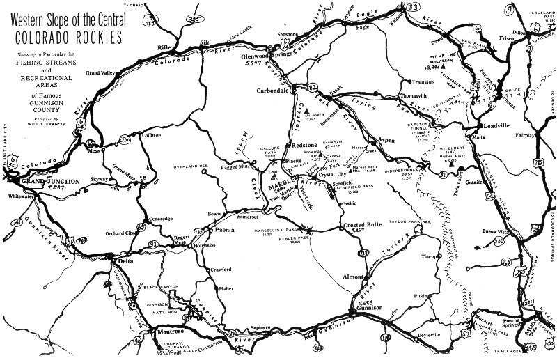 Western Slope of the Central COLORADO ROCKIES Showing in Particular the FISHING STREAMS and RECREATIONAL AREAS of Famous GUNNISON COUNTY Compiled by WILL L. FRANCIS