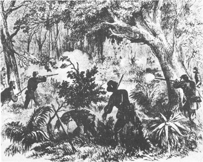 Skirmishing in the heavily wooded and flooded bottom lands during the bayou expeditions. From a wartime sketch.