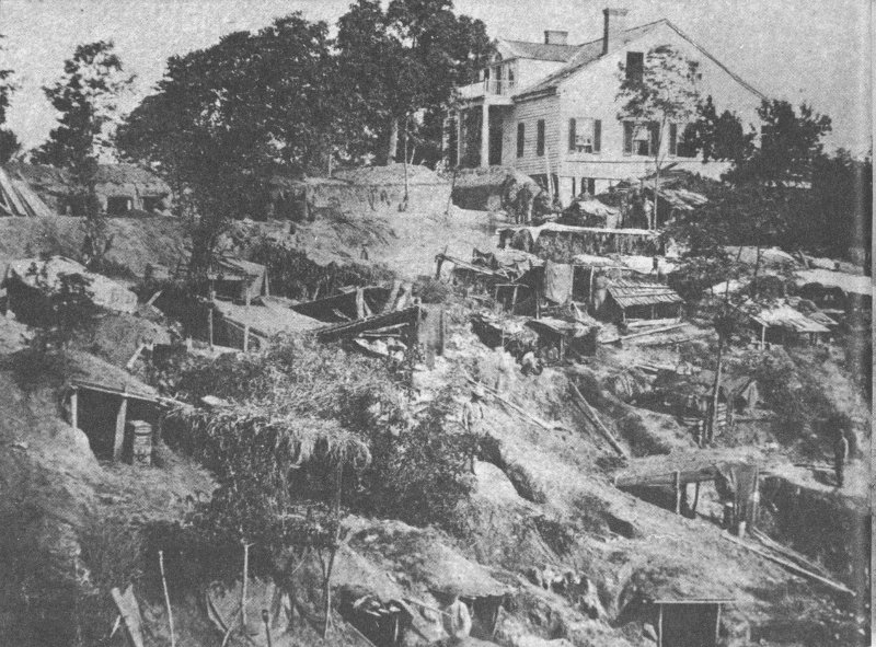 Bombproofs of the 45th Illinois in Union siege line. Shirley House in background is only surviving wartime building in the park. From Photographic History of the Civil War.
