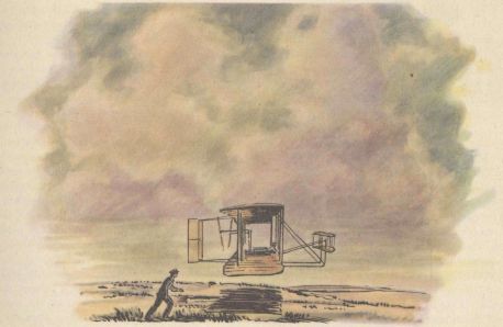 A cold wind whipped across those buff stretches of Kitty Hawk on Thursday, December 17. A coin was tossed into the air between Orville and Wilbur Wright. Orville won the toss, climbed up and stretched prone on the wing of the flying machine. He clutched the controls.