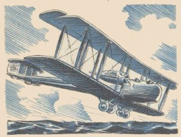 Equally important was their solution of the problem of controlled flight. Their knowledge of the effect of air on the surfaces of the wings helped the Wrights solve the problem of control. By warping the wings they were able to turn the plane to the right or to the left. When a wing-tip was warped downward it increased the lift of the wing, causing it to rise. The opposite wing-tip warped upward lost lift and the plane would fall off toward the low side. The effect was that of dragging one oar of a boat in the water. To aid in turning the plane, the machine was provided with a vertical rudder attached to the lateral control. When the wings were warped, the rudder automatically swung to enforce the turn.