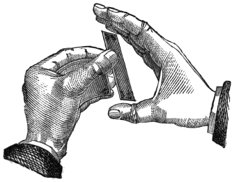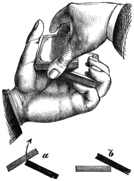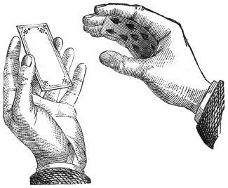 The art of magic, as it is now understood, is no longer a secret and mystic profession; it is a written art, and may be easily acquired by the clever mechanician, or any person having dexterous hands and a large amount of self-possession and impudence. I say “impudence,” because most of the best tricks are really so extremely simple that many persons of a timid or self-conscious disposition would feel ashamed to venture to perform them, in case of what they think must be inevitable detection and exposure. But so blind is poor human nature that the clever conjuror can always select his man for “forcing a card upon him,” even though he makes his dupe believe he has selected one at his own will and choice. At the request of a large number of friends, I will conclude this volume by giving a few tricks which may be performed after a very little practice by anybody who will take a little trouble, and for the execution of which no, or very little, apparatus will be required—at any rate, only such as can be obtained either in any ordinary house, or at a very trifling expense. The task which I have set myself is not, as the reader might imagine, an easy one, for in endeavoring to give some tricks which have not before been already fully explained in books published on the subject, I find that there is scarcely a parlor trick which has not already been explained. Therefore, to give some tricks that have never yet been exposed is really a very difficult and almost impossible task. However, I have done my best, and the following little deceptions which the amateur conjuror may safely perform, will enable him to give a capital evening’s entertainment to his friends or family circle. I would just add one word before quitting the subject of magic and559 conjuring. My object in the foregoing chapters was to show the reader, first, that the art of magic is merely the art of a very clever illusionist, who, by swiftness of execution and a thorough knowledge of the laws of mechanics and optics, can make his audience deceive themselves; secondly, to afford some entertainment to my readers; and, thirdly, to set the ingenious at work to solve the mysteries of the art upon the basis I have given in these chapters. I venture to think, from the observations I have heard, that all these objects have been attained. And now for a few parlor tricks.