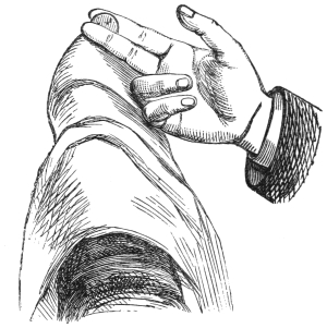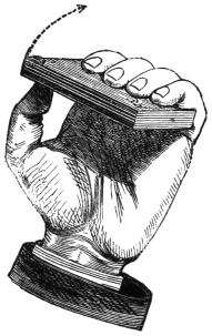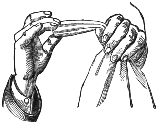 IV. The Bleeding Thumb.—This is a very effective trick, but I am afraid, unless my pupil has some little self-sacrifice, and does not mind enduring a trifling pain in order to amuse his audience, this trick will never be performed. Previous to doing it, you puncture your thumb with a needle in one or two places, near the nail. You then assert that you will cut open your thumb and instantly heal it. You take a handkerchief and tightly bind the thumb therewith, keeping the thumb perfectly straight. You ask for a knife—the sharper the better—and, having obtained one, you pretend to cut the thumb, which you bend. This causes the blood to flow from the punctures. The blood spreads along the knife, which looks as though it had cut almost through the thumb. You then wipe the blood away, straightening the thumb, and show that there is no sign of wound or blood.