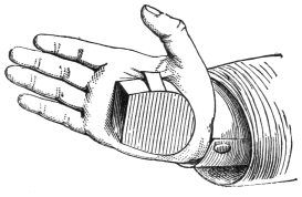 VIII. Carrying Fire in the Hands.—In performing this extremely simple trick, the audience must not be informed of what it is your intention to do, but it should be done when there is any delay in your other tricks, or some hitch occurs in getting anything you require, and which happens not to be at hand. For filling up a gap in a performance, it will be found extremely useful. In giving an entertainment of magic, always have on your table two burning candles; they are both useful and ornamental, and serve to dispel any idea of the spectators that you cannot perform your tricks in a full light. You go to the table, having previously concealed a piece of paper in your hand between the two middle fingers, and place your hands around the flame, saying it is perfectly possible to retain the heat in the hand, and even carry the flame from one candle to another. You then blow out one of the candles, and quickly place your hands round the other, set fire to the paper in your hand, blow out the candle, quickly light the first and then the second, smothering the flame of the paper in your hand. This trick, when well done, causes great astonishment and surprise.