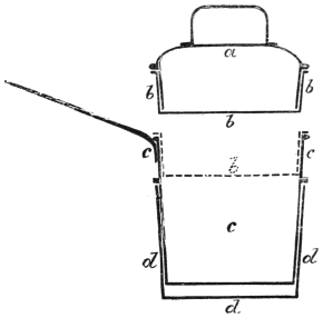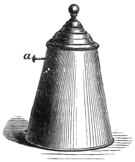 VII. Bautier’s Great Ink-and-Water Trick.—This trick, first introduced by Bautier, at the Egyptian Hall, London, has, to the best of my belief, never before been explained. It is a remarkably clever deception, and, when dexterously performed, defies detection. It consists in showing a decanter filled with ink and another with water, and while each decanter is held by one of the audience, making the contents of each change places, the ink going into the one containing water, while the pure liquid is found in the one in which the ink was seen. Take two water bottles or decanters, and in one place a tassel of black fleecy wool, just long enough to touch the bottom of the bottle. The tassel must be tied by a knot at the top, and a small piece of string just hanging over the mouth of the bottle, attached to the knot. Then fill the glass with water. The bottle thus prepared looks at a short distance like a bottle of ink, and you have only to tell your audience that it is so to make them believe it. This, I am afraid, is inculcating in the mind of the reader the principle of falsehood—at least Mrs. Grundy might say so; but a professor of magic is doing nothing but telling “crammers” from the commencement to the conclusion of his entertainment. Perhaps this is the reason why it is called the “black art,” and was the cause of so much persecution in the “good old days,” when all was so pure and so virtuous, as the lovers of the beaux temps would have us believe. But pardon this digression. In the other bottle place a weak solution of the proto-sulphate of iron, about a half ounce to about a pint and a half of water. Have ready a bit of pyrogallic acid—about two-thirds of a tea-spoonful, wrapped in a small piece of blotting-paper that has been blacked with ink. Having completed these arrangements, and asserted that you have on the table a bottle containing water and another ink, you borrow a handkerchief, with which you cover the bottle containing the clear solution, and in doing so you slip into it the pyrogallic acid; and in handing the bottle to one of the audience to hold you give the contents a little imperceptible shaking. You then take another handkerchief and place it over the other bottle, which you hand to a person to hold. You then command the contents of each bottle to change places. Then, in removing the handkerchief563 from the ink bottle, you clutch the piece of string and quickly pull out the black wool and throw the handkerchief out of sight, showing the bottle to contain only water. You then ask the person holding the other bottle to remove the covering, when the fluid will be found to be “as black as night.” This trick always causes the greatest astonishment.