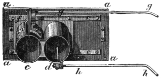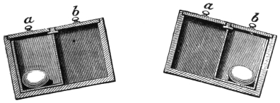 Another trick which has been performed by Messrs. Maskelyne and Cooke is that known as the spiritual musical box. An oblong piece of glass is suspended by means of four cords hanging from the ceiling, and upon this glass is placed a musical box. At the word of command the box begins to play, and when desired by the exhibitor or one of the audience, it suddenly ceases. The effect is really marvellous, but the secret of the trick is very simple. In the box there is placed a balance lever, which, when the glass is in the slightest degree tilted, arrests the fly-fan, and thus prevents the machinery from moving. When the performer gives the word of command, the glass is made level, and, the fly fan being released, the machinery moves, and a tune is played. When commanded to stop, the cord556 on either side is slightly pulled, the balance lever drops, the fly fan is arrested, and the music ceases.